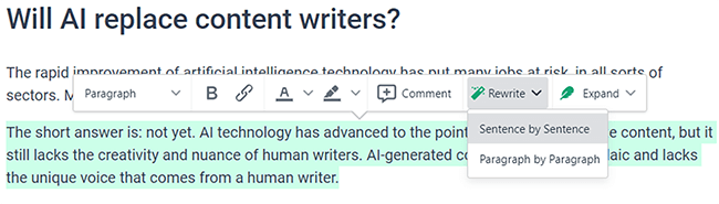 All you have to do is highlight the text, and click Rewrite. Then, choose whether you want to rewrite it sentence by sentence or paragraph by paragraph.