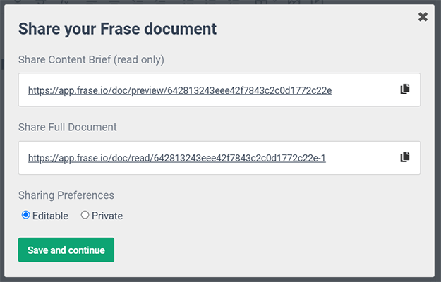 From the Content Editor, you can click the Share button to grab a link to the document or content brief, which you can then share with your team.