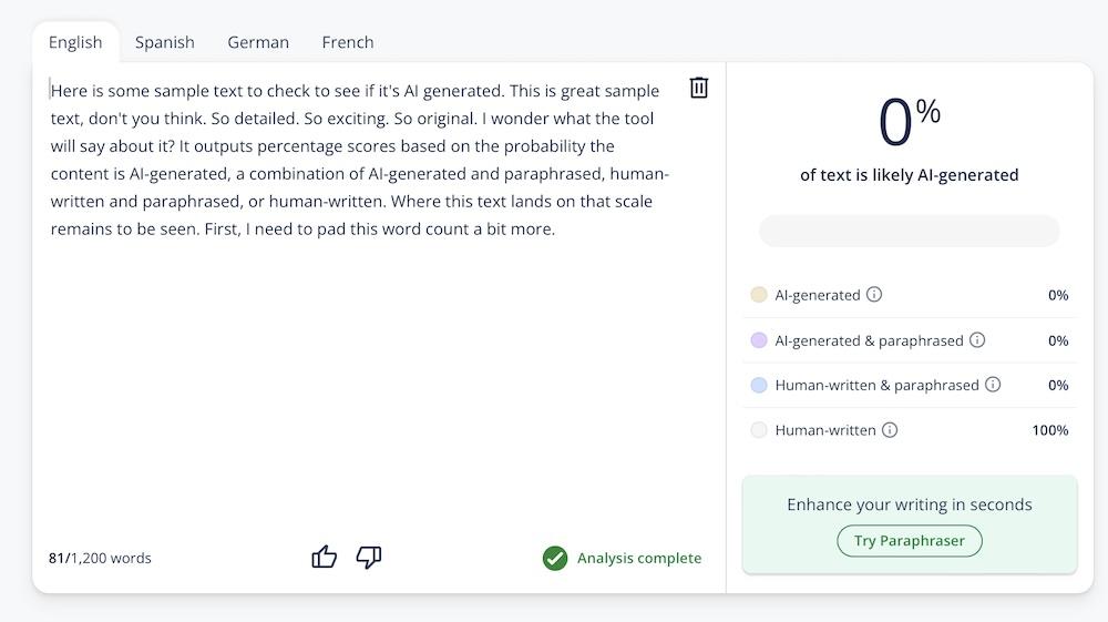 - Click Analyze text. The detector will analyze your text and provide feedback on its originality and whether it appears AI-generated or human-written.