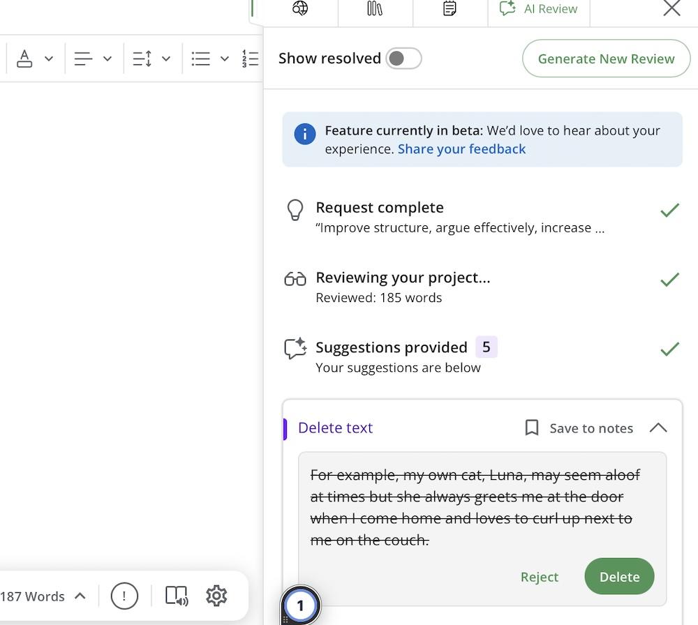 QuillBot’s AI review feature analyzes your text and provides feedback on clarity, tone, and style.
