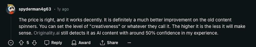 “The price is right, and it works decently. It is definitely a much better improvement on the old content spinners. You can set the level of ‘creativeness’ or whatever they call it. The higher it is the less it will make sense”.