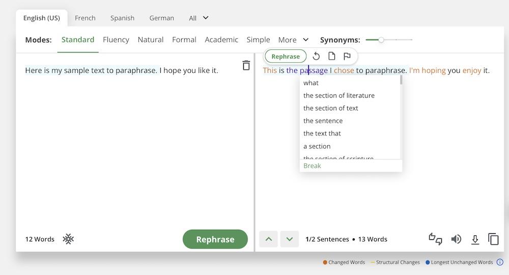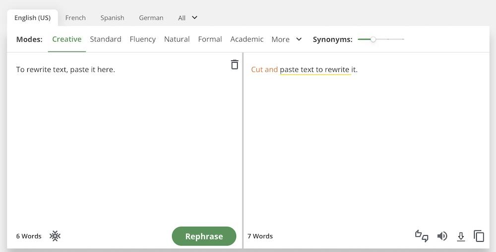 QuillBot’s paraphrasing tool allows you to rephrase sentences, paragraphs, or entire articles to improve clarity and readability while avoiding plagiarism.