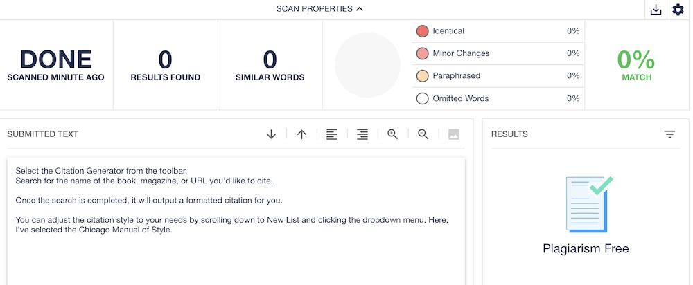 - Once completed, you’ll see a results page, which shows the results found, similar words used, and the percentage the text matched other text.