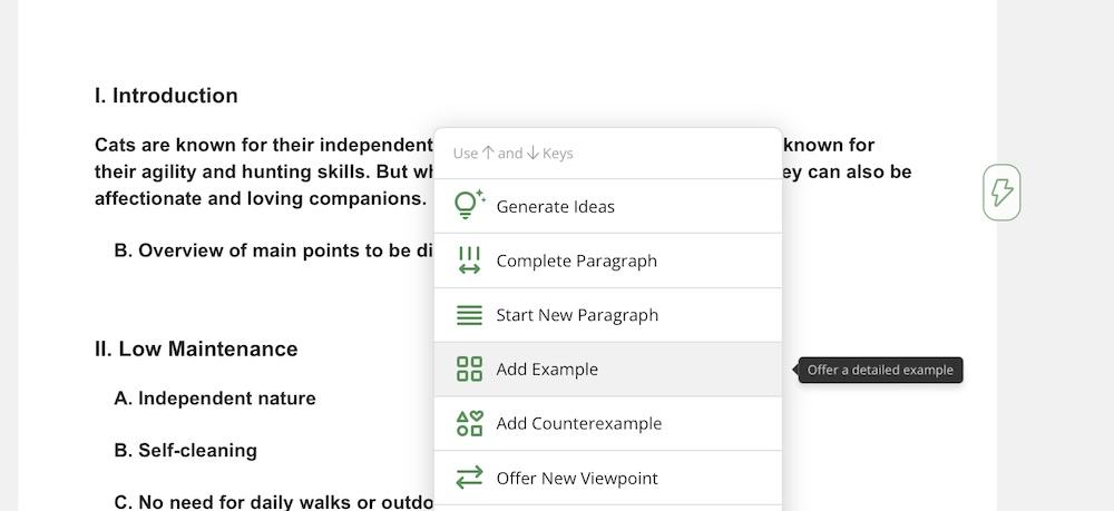 - You can also click the lightning bolt icon next to the text window to open the Flares options. Here, you can have the AI finish your sentences, suggest new ideas, offer examples, and counter examples.